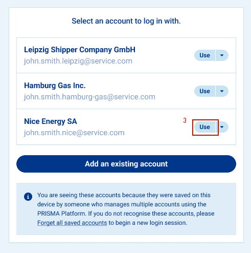 If you have already added one or more accounts to your browser, you can easily switch between them directly on your PRISMA account. These accounts will remain active for 24 hours without use, unless you log out of them.