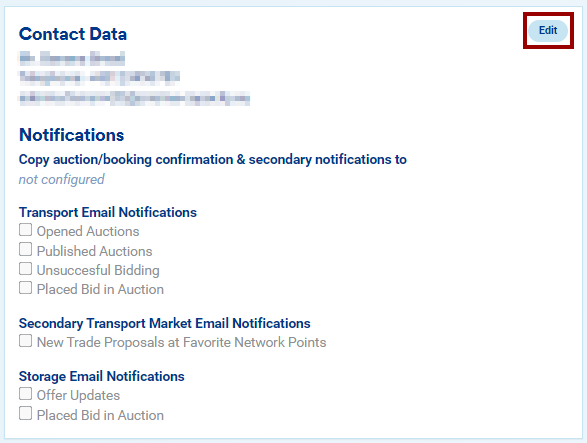 Under "Company Data," you can manage some of your company details. To do so, click on the pencil icon in the top-right corner of the page. You can change your (1) company address, (2) bank details, (3) billing address and add (4) a capacity user DVGW code.