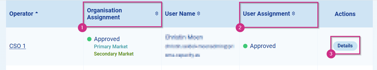 1. The status in the column "Organisation Assignment" refers to the assignment status of your Organisation with the Operator.