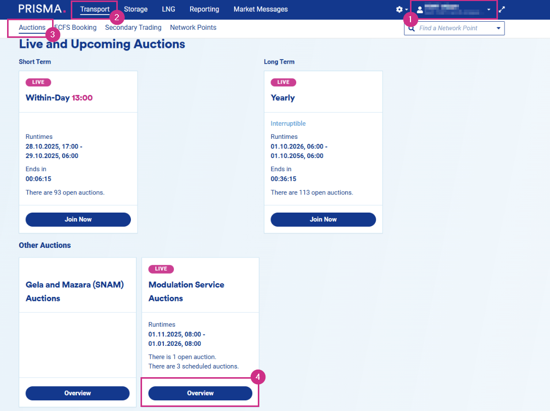 4. Under "Live and Upcoming Auctions," find the “Modulation Service Auctions” card and click on "Overview";