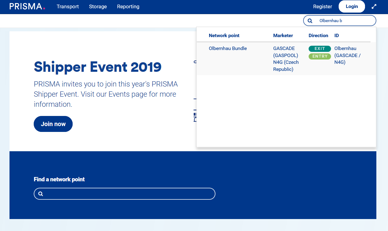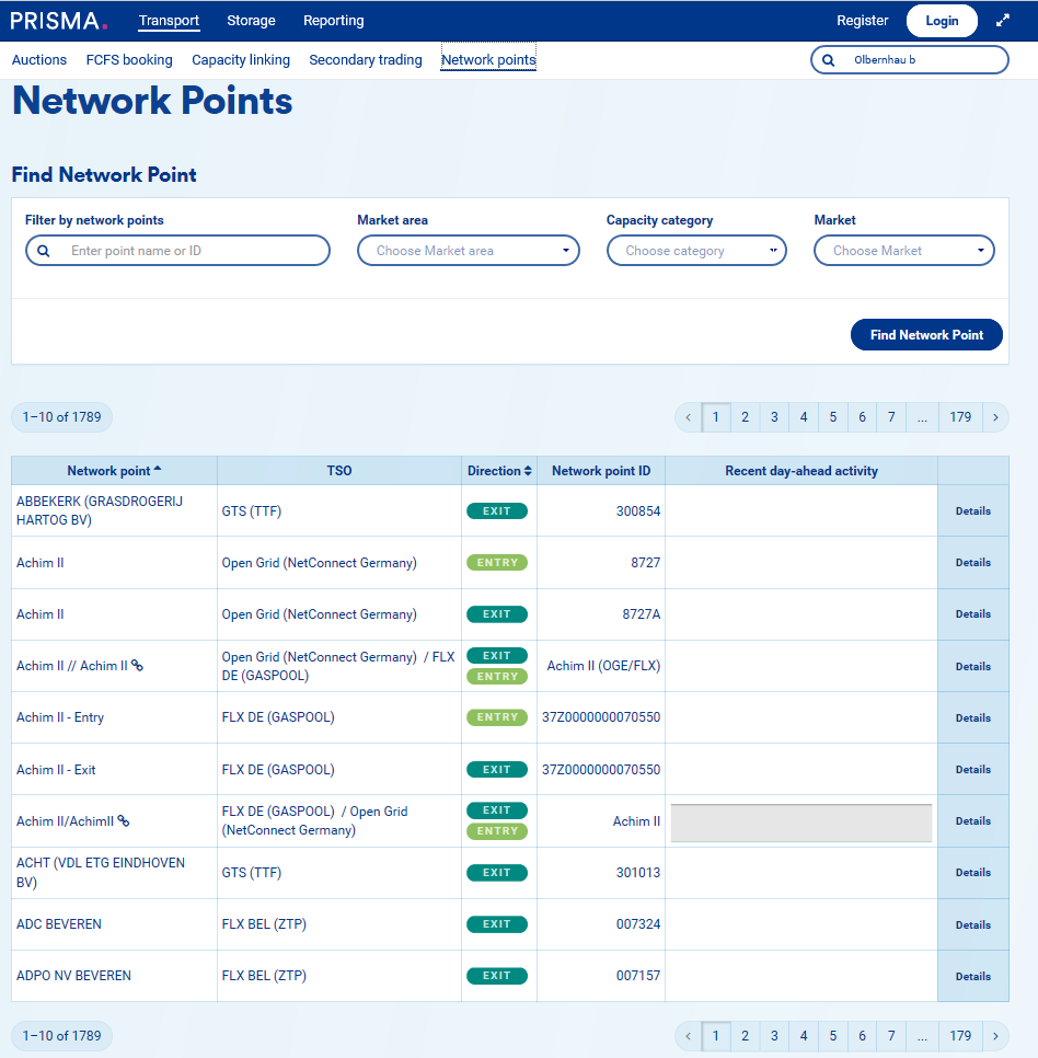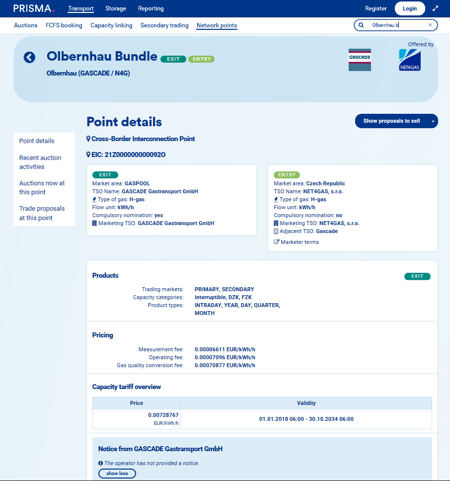 The PRISMA platform allows you to find the details pertaining to a certain network point. In this manner, you can find general information and auctions, which take place there.