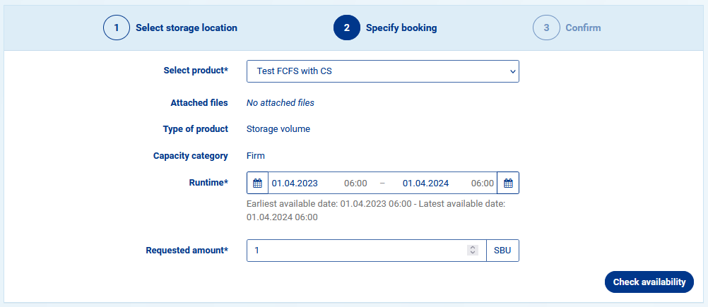 7. Proceed to step 3 by clicking on "Check availability". In this time, the platform performs a check with the SSO's backend system to see if the requested capacity is available for FCFS booking.