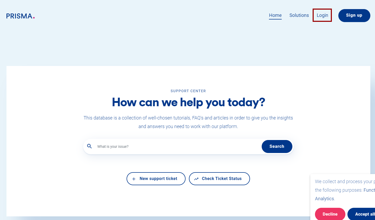In this article, you can find out how to log into the PRISMA Support Portal where you will find our knowledge base and be able to manage your tickets with the Customer Success Team.
