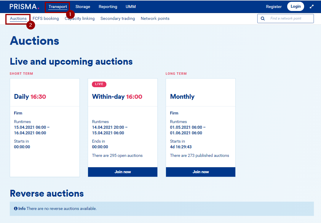 3. Scroll to the bottom of the page to display the auction calendar. The scheduled auctions shown here are according to the ENTSO-G auction calendar.