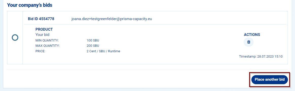 If, instead, you wish to place a second bid, click on the button "Place another bid" and go through the bidding steps again: